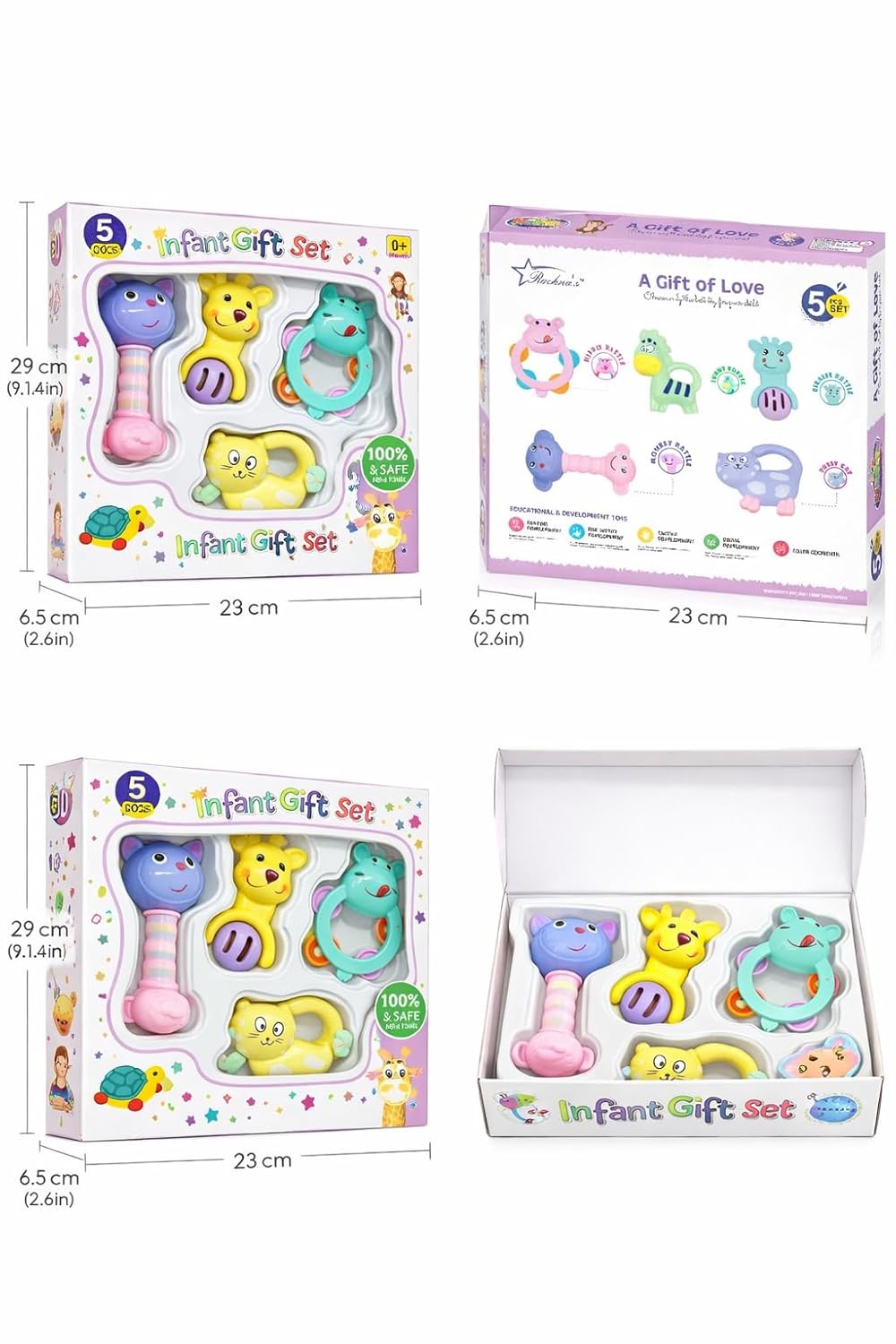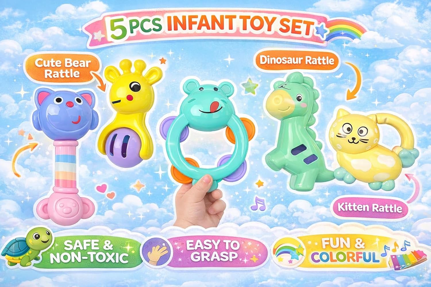 This infant rattle set is a must-have for new born baby essentials and daily baby care. Designed specially for babies 0+ months, this baby toy set helps in early sensory development while keeping your baby engaged and happy. Made from BPA free, non-toxic material, these baby rattles and teething toys for babies are completely safe for chewing, shaking, and gripping. Ideal for baby toys for 0 to 6 months and useful even as baby toys for 6 to 12 months, this set supports learning through play. A perfect choice for new born baby gifts, baby shower gifts, and everyday baby essentials. ⭐ Key Features 🧸 Safe & Baby Friendly BPA free, non-toxic material Safe for newborn baby toys 0-6 months Gentle on baby gums and skin ✋ Easy Grip Design Lightweight & easy to hold Helps babies develop grip strength Ideal baby toy for small hands 🔊 Sound & Sensory Stimulation Soft rattling sound for hearing development Bright colors support visual development Perfect sensory toys for babies 🦷 Teether + Rattle Combo Works as baby teething toys Helps soothe sore gums Useful during teething phase 🎁 Perfect Baby Gift Ideal for new born baby gifts Suitable for baby boy & baby girl Great addition to baby gift set 🌱 Benefits for Baby ✔ Supports sensory and motor skill development ✔ Helps improve hand-eye coordination ✔ Keeps baby calm, curious, and engaged ✔ Safe play option for newborns & infants ✔ Completes daily baby essentials kit 👶 Age Recommendation Suitable for: Newborn baby toys 0–6 months Also useful as: baby toys for 6 to 12 months