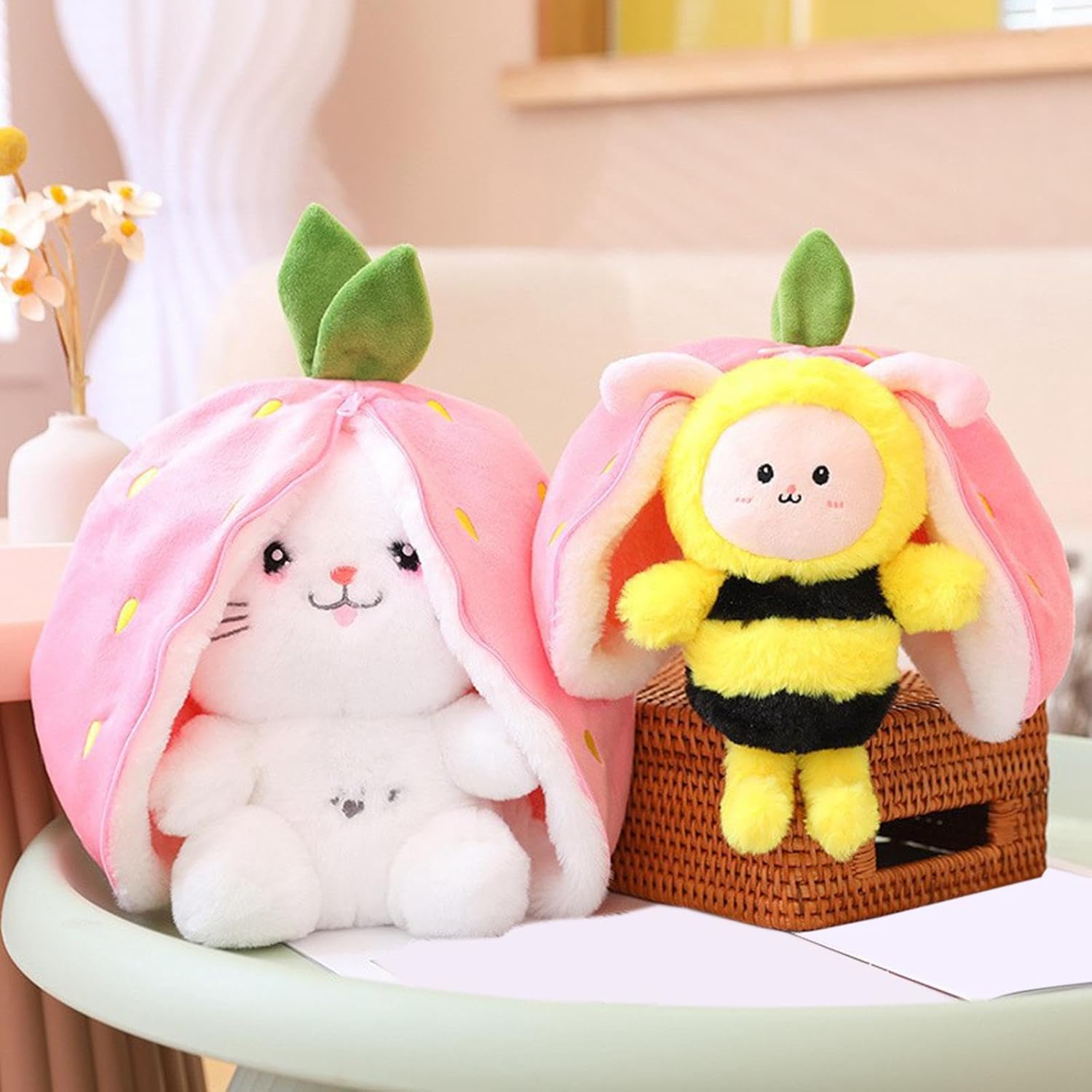 2 in 1 Stuffed Toy: Plush baby toy has an adorable appearance, quality, soft, huggable plush designs brings a lifetime of joy and companionship. soft stuffed fruit turn into bunny animal, more funny!