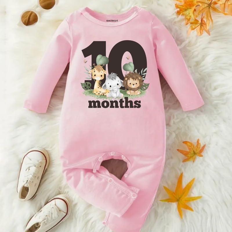 KNITROOT Mix Animal Theme (Giraffe, Elephant & Lion) 10 Months Pink Color Jumpsuit Made from 100% pure cotton, natural, breathable fabrics. Full Sleeve, Shoulder-Snap-Buttons, Knee Length Cotton Jumpsuit Stretchable fabric allows for maximum comfort and freedom. Long-lasting prints with a lovely embossed texture and adorable captions.