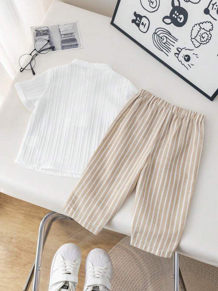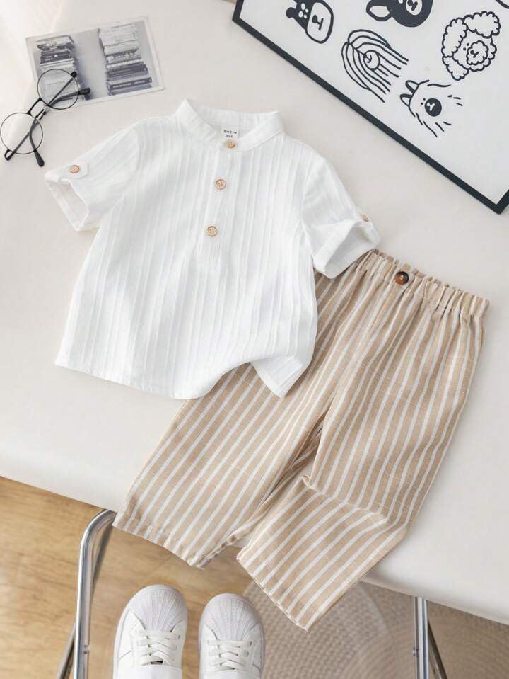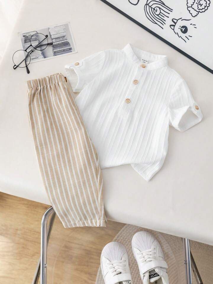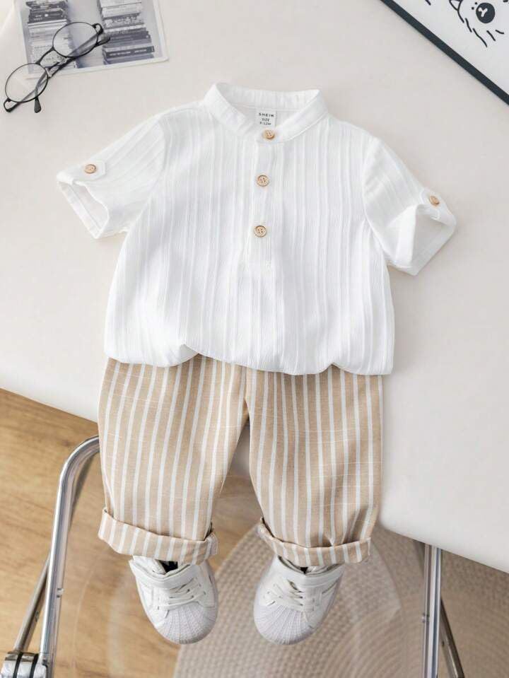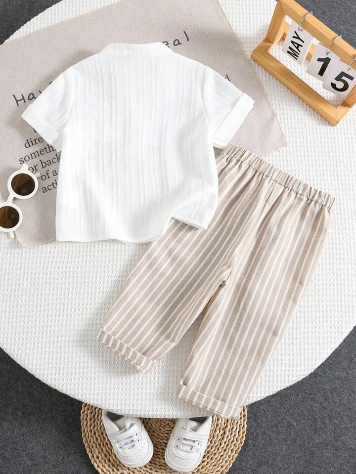 Dress your little one in comfort and style with this Trendy Cotton Baby Boy Outfit Set, featuring a classy half-sleeve mandarin collar shirt paired with striped cotton pants. Crafted from soft, breathable, and skin-friendly cotton fabric, this outfit ensures your child stays cool and comfortable all day long.The shirt’s wooden button detailing adds a touch of elegance, while the pants feature a flexible waistband for easy movement and a perfect fit. Ideal for daily wear, playdates, family outings, photoshoots, and festive occasions, this outfit brings a modern yet traditional charm to your child’s wardrobe.Designed for durability and easy care, this set is machine washable and maintains its shape and color even after multiple washes. Whether you’re looking for a comfortable summer outfit, a birthday gift, or a stylish ensemble for casual outings, this outfit is a must-have for every little gentleman.